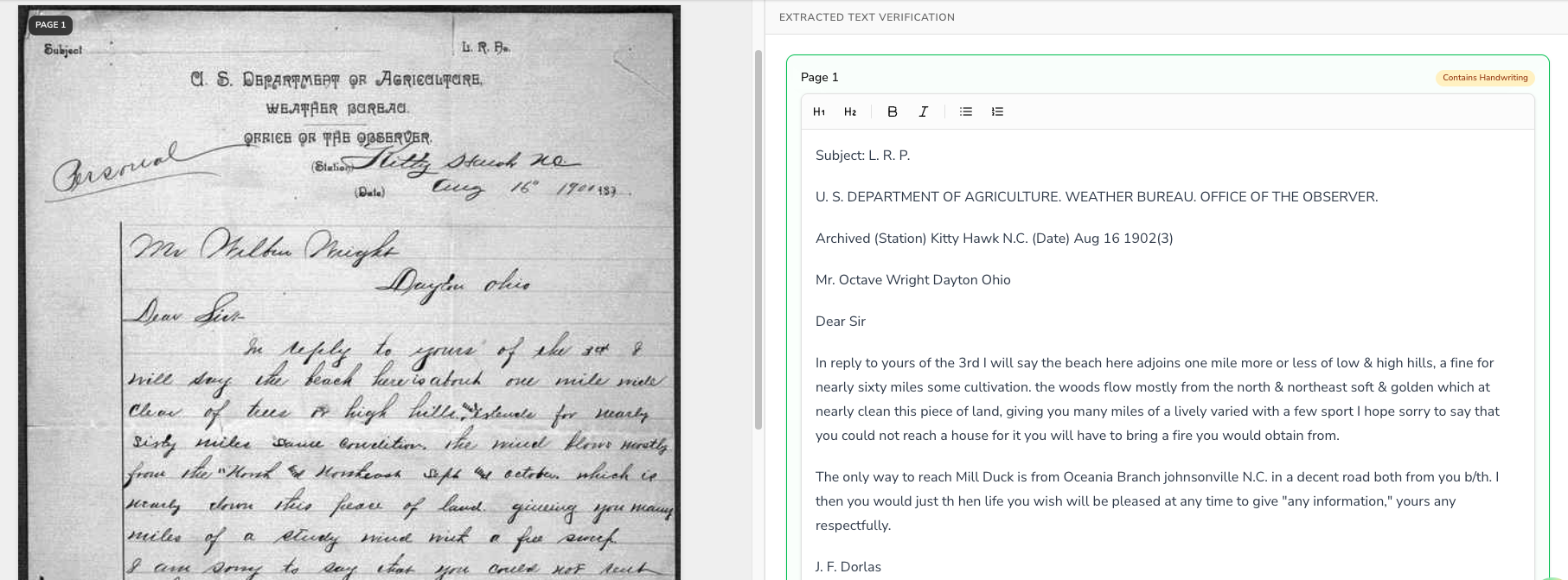 Eliminate the guesswork of black-box AI. LetterScript alerts you to low-confidence handwriting, allows you to correct the text, and logs every single keystroke. Accuracy, backed by an immutable chain of custody.